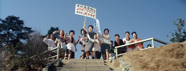 ある日、やっと彼らが嗅ぎ付けたもめ事は、団地マダムと商店街とのもめ事。団地マダム達がトラックの荷台に乗り、ボイコットを叫びながら地元商店街を走行して行く。 ここはどうやら新駅として開業してそれほど年月が経っていない小田急線百合ケ丘駅(1960年3月25日開業)の南側の商店街のようだ。 駅前走行シーンは、この1カットだけでわずか数秒。 この百合ヶ丘駅の南口は「東宝映画のロケ地を訪ねる・喜劇駅前団地」や「東宝映画のロケ地を訪ねる・喜劇駅前飯店」の調査で何度か見てきた。だからひと目で「あ、ここは百合丘だ」と分かったのだが・・・・。 しかし、この1カット、実はちょっと不思議な1カットなのだ。 |