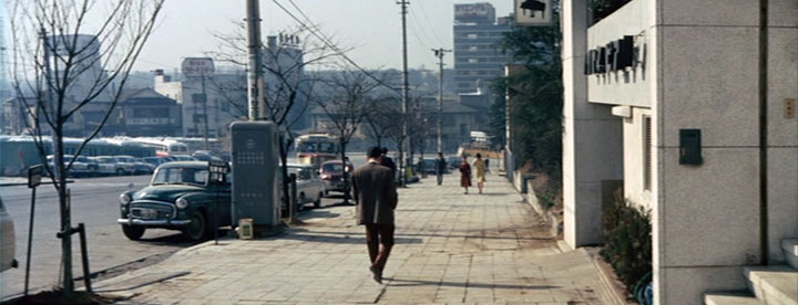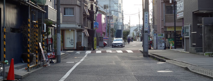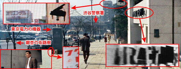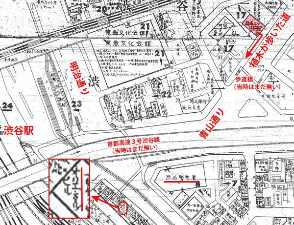 ![]() ![]() (撮影・2016・03・22) ↑ 上田がしょぼくれた顔をして階段を降り、会社の外へ出る。 ![]() ![]() (撮影・2016・03・22) ↑ この会社を出る場面のロケ地はどこだったのか。それを探る材料は、うなだれた上田が向こうへ歩いて行く、このわずか1カットから探すしかない。 この1カットには何が写っているのか。画面の右側には先ほど上田が階段を降りてきた会社の建物がある。建物の外壁には浮き出た文字が見える。しかし角度が斜めすぎてよく読めない。建物に面している道路は車道も歩道もかなり広い。そして向こうに向かって下り坂のようだ。その他に写っているものは遠くにビルがいくつかと、あとは木造の建物くらい。 これでここがどこだか分かるのだろうか。 ![]() ↑ まずビルの外壁に浮き出た文字の判読を試みる。Photoshopでなるべく正面向きに補正。するとなんとか「◯◯ヤマピア◯」のように見える。袖看板にピアノの絵があるので「◯◯ヤマピアノ」か。植木が建物から出るカットの右端に何か表示があるが全部は見えない。一番見える一コマで「フク」まで読める。これで全文字判読。「フクヤマピアノ」だ。 ところで「フクヤマピアノ」って何だ。ピアノを扱う楽器店だろうか? 調べると、これはかつて存在したピアノメーカー(正確には製造を外部に依頼したピアノブランド)だということが分かった。 「フクヤマピアノ」の本社、支社、販売店、ショールームなどがあった場所を検索するが出てこない。行き詰った。 植木の行く手にビルが見え、屋上に「オリエンタル」と書かれた広告塔が見える。「オリエンタルカレー」の広告だろうか。これも分からない。 行き詰まったまま数年。 「麻布 田能久」さんから連絡。 「あそこ、分かりましたよ。渋谷の青山通りですよ」 「なんで分かったんですか?」 「まず、あの道路の広さですよね。それと下り坂。それで探していたら植木が出てきたビルが残っているので見つけました。画面ではわからないですが都電の線路もあったはずですよ」 やっぱりすごい、この人は。 ![]() ↑ 1969年(映画撮影の6年後)住宅地図(提供・「麻布田能久」さん) ↑ そうなってくると「オリエンタル」も見つかった。ビル名だった。方向もばっちり合っている。しかしこれは現在解体されていて存在しない。仮にあったとしても現在では手前にそびえる「渋谷警察署」に遮られて見えないはずだ。そういえば植木の歩く先に、大きめの2階建ての木造建物が見えた。あれは当時の「渋谷警察署」だったのだ。 (協力・「麻布 田能久」 さん) 撮影地ストリートビュー |