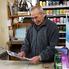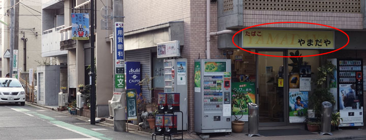 角の「食料品の山田屋」さんで、ご主人にお話を伺うことができた。 現在ではたばこ店をされている。画面のプリントを見ていただき、 「こちらのお店が昭和38年(1963)に撮影された映画に写ってらっしゃるのですが、ご存知でしたでしょうか」 「家内が植木さんたちがこの近所で撮影したのを見物したと言ってますよ。私は覚えていないんですがね。うちがここで店を始めたのが昭和35年(1960)なので、3年後だったんだなあ」 とのこと。お話を伺う時は不審に思われないように、 「実は趣味で、昔の映画に写っている場所を探して回ってるんですよ」 と聞かれもしないのに説明することにしている。そうしたら、 「いい趣味をお持ちですね」 と言っていただけました。よし!がんばるぞっ! (撮影・2016・03・21) |