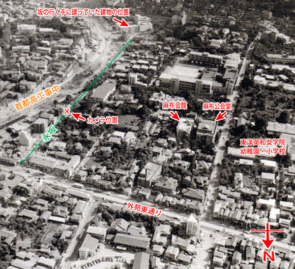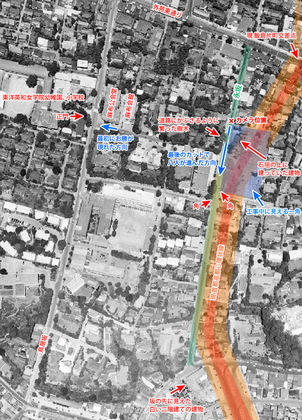 丁字路の角に建つ警察署脇に入ったと見せかけて、実は脇に入らないで警察署前の広い道路を左右どちらかに進んだのだろうか。 現地で見てみると警察署に見立てた「現 港区立麻布区民センター」に面した道路、これは「鳥居坂」と呼ばれる道だが、実際に坂になっているのは南に(警察署から見て左に)300メートルくらい行った先からであり、警察署の角からは脇道を含めて三方向どちらに向かっても坂ではないのだ。 ということは、お勝が警官におじぎをしながら去っていくこのカット、警察署前のカットからつながってはいるが、別の場所にカメラを移して撮影したと考えざるをえない。 ではこの「鳥居坂」を300メートル南下し、実際坂になった位置で撮影したのだろうか。道幅は似ている。しかしこんなに長い坂ではないし、道の両脇の様子もどうしても違う。 上田らが下った坂をよく見てみよう。下の写真のような特徴がある。 ![]() 警察署に見立てた「麻布公会堂」、現「港区立麻布区民センター」付近を現地で少し見てまわるが見つからない。この地域は坂が多い。 帰ってからストリートビューで上記のような特徴の坂道があるか、もうすこし範囲を広げて見てみる。見つからない。 石垣や塀はもう残ってないかもしれない。しかし坂という地形や道幅というのは、そうは変わっていないはずだ。うーん、しかし見つからない。 ご覧の通り、別にどうということのない場所だ。坂の上なので遠くが見渡せるくらいが取り柄の場所なのだ。この1カットのラストカットを撮るために、わざわざ「麻布公会堂」から離れて遠くへロケに行くとは、どうしても思えなかった。近い場所に違いないと思うのだ。しかしこのような坂道はどうしても見つからない。 この撮影日は遠くが霞んでしまっているが、よく晴れた日には正面に富士山が見えるはずだったのではないだろうか。ラストのカットとしてはふさわしい。それなら少々離れた場所に行ってでも撮影する理由がある。たまたま当日は霞んでしまって富士山は見えなかったが、スケジュールの都合で撮り直しはできなかった。おー!これはいい考えだ。「富士見坂」という名前の坂や、西に向かって下る坂を当たってみる。見つからない。違ったか。 「Yahoo!知恵袋」で聞いてみる。ご親切なお答えを頂いたが、今ひとつ明確に合致しない。 「麻布田能久」さんから「東京の坂」に関するサイトを教えていただいて、二人で手分けして探す。見つからない。 遠くなのか。いや、そんなはずはないと思う。しかしこれだけ探して見つからないんだから、もうこんな坂、今は無いのではないか。・・・そうか!無いのか! これがヒントだった。 ![]() 1963年航空写真 国土地理院 ↑ 「現 港区立麻布区民センター」の東方、200メートルくらいの所には首都高速(都心環状線)が通っている。映画撮影当時には存在しなかったものだ。もしかしたら首都高建設のために無くなってしまった坂ではないだろうか。 そう考えながら映画公開と同年の航空写真を見てみる。 上田らが行く坂道の左側は石垣の上が工事中のような感じに写っている。これをたよりに探してみた。 すると麻布公会堂(現 港区立麻布区民センター)から東に200メートルくらいの所で工事中のように見える一角があった。この当時工事中であった一角を左に見て道を進むと、現在ではわずか100メートルくらいで首都高速が通っている所と合流してしまう。当時は映画に写っているように長い坂だったのが、現在は首都高に分断されていたのだ。それにともなって坂の長さだけでなく、両脇の様子もまるで変ってしまっている。坂は無くなってはいないが大きく変わっていた。 この坂は「永坂」という。当時は500メートル近くも直線に伸びる長い坂(これが「永坂」という名前の由来だろうか)だったが現在は半分以下になってしまっていた。 ここだと見当がつくと、映画画面と航空写真で合致する部分がいろいろ見つかり、裏付けされる。 坂の長さは申し分ない。先の方で平坦になるのも現況と一致するし、坂の下った先に斜めに見える二階建ての建物も確認できる。 八人が向かう右手に、大きな樹木が道路にかぶさるように枝を伸ばしているのも航空写真で確認できるし、そのほぼ対面の石垣の上の建物も見える。 なぜここに場所を移したのか。クレージーら八人が道路いっぱいに広がって踊りながら進んでいく。撮影用に用意された何台かの自動車はそれを避けながら通る。麻布公会堂の前の道は路線バスも通る交通量、撮影の為の道路の占有が難しかったのかもしれない。それに、どうということのない場所、と書いたが、こんなに一直線に伸びる長い坂は珍しいかもしれない。 坂の下った先に斜めに見える二階建ての建物、あれは何の建物だったのだろうと思って参考のために住宅地図で調べてみると「警視庁麻布鳥居坂警察署」だった。 警察署に見立てた所から少し場所を変えて撮影したらまた見える本物の警察署。