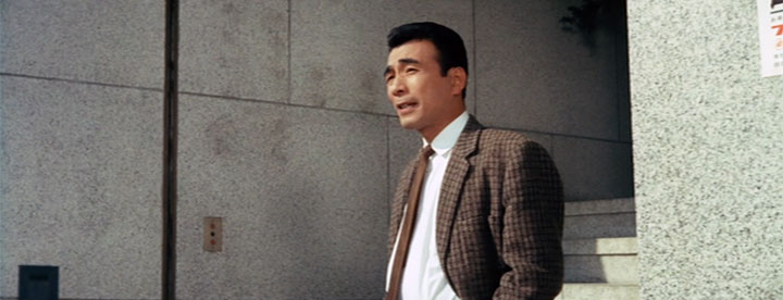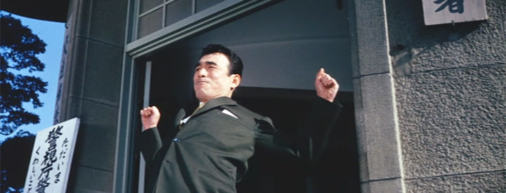 ああ、なんという素晴らしい歌だろう。 さて、1962年に古澤憲吾監督により「ニッポン無責任時代」「ニッポン無責任野郎」の二本の植木等主演作品が製作され、大ヒットする。クレージー映画のスタートだ。その次に作られたクレージー映画三作目が本作品「クレージー作戦 先手必勝」。監督は駅前シリーズを多く手がけられている久松静児監督。前二作とはまた違った味わいの作品に仕上げられている。 無責任サラリーマンの上田ヒトシ(植木等)は喧嘩で警察のご厄介になり、勤めている会社をクビになる。 上田が会社を去るシーン。 |