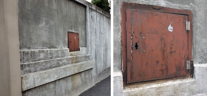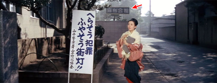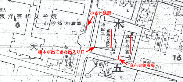 ![]() ![]() (撮影・2016・03・31) ↑ 警察署を出る上田。この場面だけではどこだかわからない。次の場面を見てみよう。 ![]() ![]() (撮影・2016・03・31) ↑ 上田の釈放を聞いて、お勝(池内淳子)が出迎えに来ている。 立て看板に「山手警察署」と書いてあるが撮影のための物だろう。「山手(やまて)警察署」という名前の警察署は横浜市にあるが、それとは違うと思う。東京の山の手を表した架空の警察署だろう。 お勝の後ろに「麻布会館」と書かれた看板(矢印)が見える。これも撮影のための物か? それとも本当に港区の麻布のどこかなのか? ![]() ![]() (撮影・2016・03・30) ↑ 上田を出迎える仲間の面々。 警察前の道路の向こう側はコンクリート塀。門が道路から少し入った所にある。麻布だとしたら広大なお屋敷か?それとも・・・うーん。 「麻布田能久」さんが解明。「麻布会館」は実在した。昭和44年(1969)の住宅地図にちゃんと載っている。となると警察署に見立てたのは「港区立麻布公会堂」とある建物になる。向かいのコンクリート塀と門は「東洋英和女学院の幼稚園と小学校」(当時も現在も)だ。 ![]() ↑ 1969年(映画撮影の6年後)住宅地図(提供・「麻布田能久」さん) ![]() ↑ 写真左:昭和10年(1935)に設置された「麻布区役所」。昭和22年(1947)、芝区、麻布区、赤坂区が合併して港区になった時から、「港区役所麻布支所」となる。住宅地図では「港区立麻布公会堂」となっているので、その後公会堂になったのか、あるいは公会堂を兼ねていたのか。赤楕円内の出入り口から植木が出てきた。 ↑ 写真右:平成18年(2006)、同じ場所に建て替えられた現在の「港区麻布地区総合支所」(港区立麻布区民センター)。 映画撮影当時の港区役所麻布支所、あるいは麻布公会堂であった建物、その奥にあった麻布会館、東洋英和女学院の門。映画に写っていたものはみんな新しいものに変わってしまったように見える。何か「ここで撮影されたんだ」という物的証拠と言えるようなものは残ってないのか。・・・・あるのです。 H.Kさんという方から情報を頂いた。 「小さな扉 のようなものが付いている塀は、ラストシーンの背景に映り込むそれではないでしょうか?」 小さな扉? あっ!これかっ! 現地で確認、何だろう、この扉。鉄製で鍵がかかっている。確かに映画に写り込んでいる扉に間違いないと思う。扉だけでなく、それを囲むコンクリート塀もこの付近だけは当時と変わっていないように見える。 せっかく来たのだから記念に扉にちょっと触れてみる。写真も撮る。塀の中は東洋英和女学院の幼稚園と小学校。ジジイがあんまり怪しい行動をとるのもアレなので、早々に離れる。 H.Kさん、大発見ですね! 現地では思わず興奮しました。お知らせ、どうもありがとうございました。 ![]() ![]() (撮影・2016・03・31) (協力・H.Kさん・麻布田能久さん) 撮影地ストリートビュー |