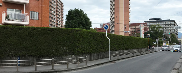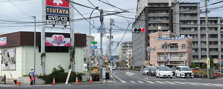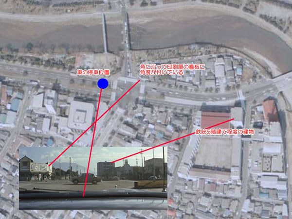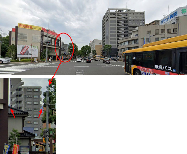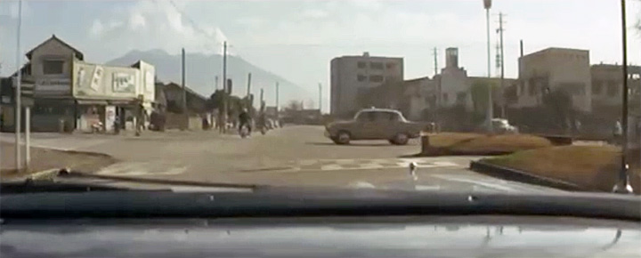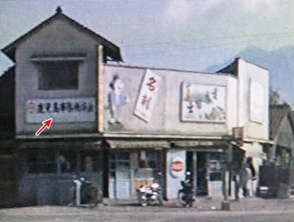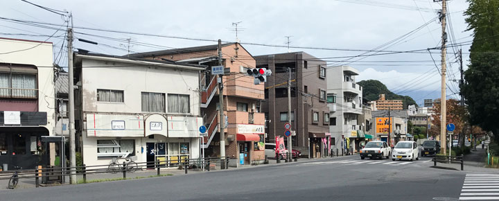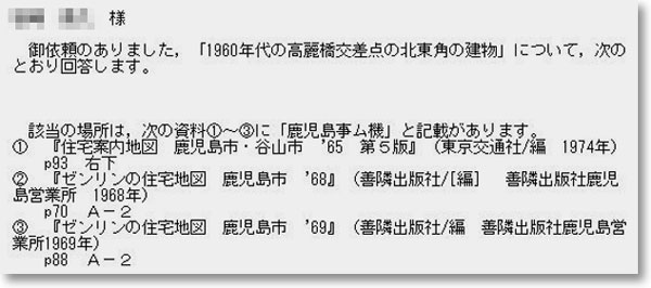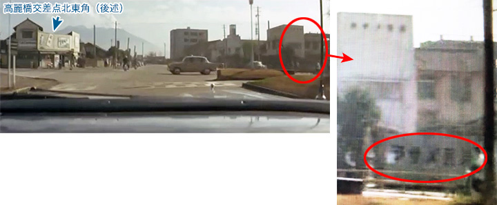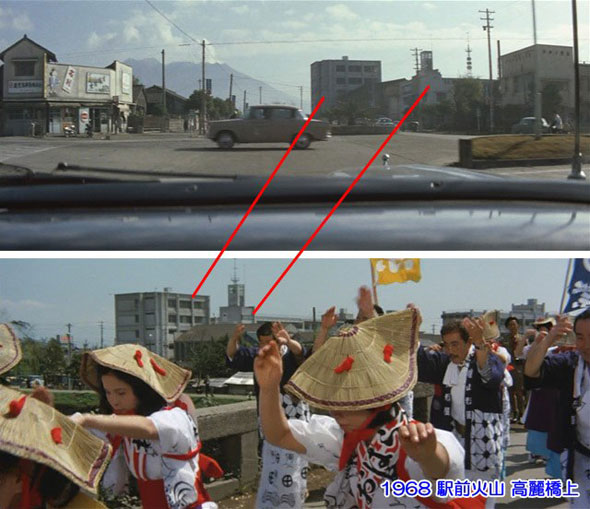 Hさんは気にはなりながら、現状の撮影を断念した場面がある。それは空港から日本澱粉に向かう車中からのカットで、場面の登場順序としては天保山橋場面と鹿児島市役所場面の間に挟まる地点だ。 ↓ それがこの場面。 広い道路を進む先に交差点があり、さらにその先には桜島が見える。 大きい交差点なのだが、当時は信号機が付いてないようで、社長が乗った車が走る道路も、交差する道路の車も、遠慮なくビュンビュン突っ込んでくる。 ![]() ![]() ↑ (1974年航空写真 作図・麻布田能久さん) 麻布田能久さんは以前から、ここではないかと推測していたという。市内の「高麗橋交差点」という地点だ。 ↓ この地点を現在(2019年)のストリートビューで見るとこう見える。 正面に桜島が見えなければならないはずなのだが建物や並木にさえぎられてよく見えない。しかしよーく見ると建物の隙間から、わずかーに桜島が見えている。方向としては間違っていないし、道幅などからして他に有力な候補地は見当たらない。 ![]() 高麗橋という橋の近くを通る、この高麗橋交差点でほぼ間違いはないと思う。 しかし麻布田能久さんは「いや、もうちょっとウラを取らないと」と、さすがロケ地特定のオーソリティ、慎重だ。 ではさらに確定材料を探してみる。 ![]() ↑ 交差点のこちらから見て右角に注目してみた。何か文字らしいものが見える。拡大してよく見ると、うーん「ラサメ〇〇」だろうか。 試しに「鹿児島 ラサメ」で検索してみる。「ヲサメ病院」という病院がある。住所は?「鹿児島市高麗町」! ズバリだ! 「ラ」じゃなくて「ヲ」かあ! ![]() ↑ 現在の「ヲサメ病院」 ↓ 麻布田能久さんもさらに証拠を探し出してくれた。 「1968年公開の『喜劇 駅前火山』の最後にこんなシーンがありましたので、社長紳士録と比べてみました。高麗橋を渡るシーンです」 「社長紳士録」で映っている鉄筋5階建ての建物と、櫓のような高い建物が一致している。これでさらに間違い無し。 この建物は当時の「鹿児島実践女子高等学校」(現 鹿児島女子短期大学)だそう。 これで決定。 ここは「鹿児島県鹿児島市高麗町・高麗橋交差点」と特定! ![]() (作図・麻布田能久さん) それから数日後、麻布田能久さんから、さらに裏付ける情報が提出されてきた。 この高麗橋交差点の北東角(ヲサメ病院の向かい側、前出の説明画像で「高麗橋交差点北東角」と示した場所)が、映画の撮影当時、何に使われていたのか。当時の住宅地図には何と記されているのか。その確認を鹿児島県立図書館に依頼していたのだという。 その回答が鹿児島県立図書館から届き、それによると、映画撮影年に近い1965、1968、1969年の住宅地図では「鹿児島事ム機」と記載があるという。↓ ![]() ![]() いや、すごいな! ではその「高麗橋交差点北東角」を拡大して見てみる。 矢印部分の看板の文字が、そう言われてみると「鹿児島事務機○○(商会?)」と読めないだろうか。いや読める。 同じ建物で、その右横には「名刺」と看板が出ている。事務機店が名刺製作もしているのは自然だ。決定!決定! いやあ、面白かった! この場面、車で交差点を通過するだけの、わずか5秒くらいのワンカット。特定材料が少ないだけに余計に面白かったのだと思う。 Hさん、麻布田能久さん、本当にご苦労様でした。 |