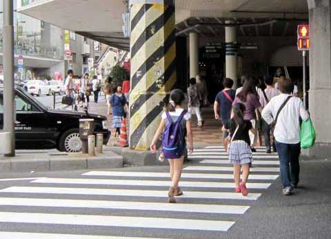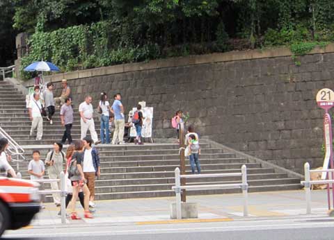 上野公園から中央通りに下る階段。カメラは上野駅に向かって走る二人を追う。公園に沿って石垣が続く。 作品撮影当時には石垣があるのみで、何も無い。 二人は道路を横断し、上野駅広小路口に入る。 |