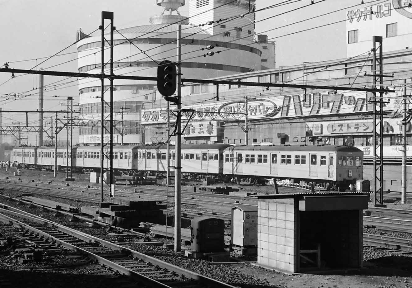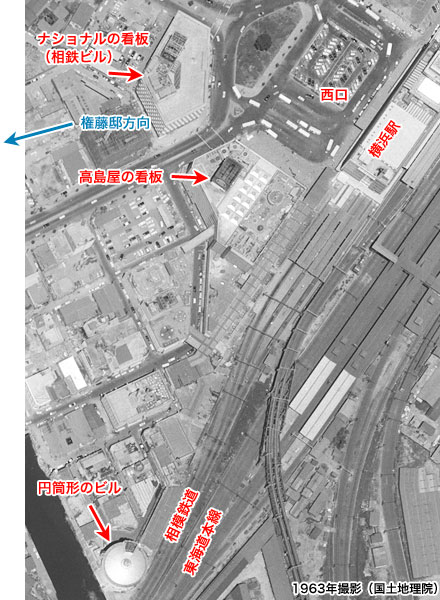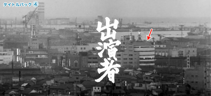 ↓ では4場面目です。 これも「出演者」と文字が入ってますが、それほど邪魔ではありません。邪魔などと言える立場ではありませんが。 ![]() ![]() (撮影・2014・07・22) 手がかり 中央やや右に円筒形のビルが写っているのが最大の手がかりです。 調査の過程 当時の地図と航空写真からこのビルを探し出すことができました。 「タイトルバック⑤」の説明の所に、この円筒形のビルが写っている航空写真を載せてあります。 結論 カメラ位置はやはり権藤邸。最初の「タイトルバック①」から、今度は逆に一画面分くらい左(北方向)に振った構図です。 ビルの右後方に黒く写っているのは相模鉄道と国鉄の線路です。左方向が横浜駅です。 この円筒形のビルは横浜駅西口の繁華街の中でも南西寄りの、相鉄線横浜駅の近くにあったようです。 現在の写真には「そごう」の看板が見えていますが、映画製作当時はまだありません。(「そごう」は1985年開業) ↓ Web上でこの円筒形のビルの様子がよく分かる貴重な写真を見つけました。タイトルバックとはほぼ逆方向から写した写真です。相鉄線の電車が走っているのが写っています。国鉄のホーム南西端から撮影されたものと思われます。ドンピシャの1963年に撮影された写真です。 ![]() 写真提供 「ナイトトレインの平成・徒然草 ~心にうつるよしなしごとを書き連ねて~」さん。 写真使用のご了解ありがとうございました。(転載を禁じます)