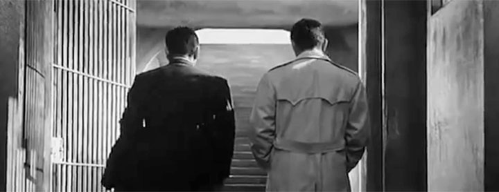もう一つ、予告編にだけ収められている場面です。 ラストシーンで、権藤は死刑が確定した竹内からの要請があり刑務所へ面会に訪れます。竹内は胸の内を権藤に告げ、最後は絶叫し、看守に抑えられ、急遽仕切りのシャッターが閉じられます。シャッターの向こうではまだ竹内の叫びが聞こえます。シャッターの手前で一人残された権藤。そして「終」マーク。 これが公開された「天国と地獄」のラストシーンです。 ところが予告編には戸倉警部と権藤が、刑務所内とおぼしき廊下を向こうに並んで歩いて行くカットが現れます。このような場面は公開された本編には登場しません。 実は「シャッターの手前で一人残された権藤」の後に、脚本上(決定稿)では下記のような場面があったようなのです。 ♯123 刑務所・廊下 権藤と戸倉が黙々と歩いて行く。 コンクリートの壁にはねかえる音がうそ寒い。 権藤は時々立ち停って振りかえる。 ここまで、あの悲しい竹内の笑い声が追って来る — そんな気持ちだ。 戸倉にも、そのやりきれない権藤の気持がよくわかる。 しかし、何か言って慰めたいのだが、言う言葉もない。 また、権藤にもその戸倉の気持がよくわかる。 しかし、何か言いたそうな戸倉の顔を見て、にがく笑うだけがやっとだ。 二人は、そのまま黙々と暗い廊下を歩いて階段を上る。 階段の上には晴れ渡った冬空をつきさすように冬木立の梢がのぞいている。 二人は、その階段を上り切って、冬木立をバックに向い合う。 権藤「ところで、貴方ともこれでお別れですね・・・今度はいつお眼にかかれるか・・・」 戸倉「いや、私なんかに用がない方がいいですよ」 二人、顔を見合わせて、やっと微笑する。 その二人の後姿が、空を横に区切った階段の上から沈むように消えて行く。 冬木立の梢だけが残る。 (F・O) (出典:「全集黒澤明 第五巻」岩波書店) そして実際、そのシーンは撮影されたのです。その中のカットが予告編に使われたと思われます。 二人が歩く廊下の先は階段で上がるようになっていて、「階段の上には晴れ渡った冬空をつきさすように冬木立の梢が・・・」につながる屋外のような明るさが見えます。そして冬木立バックのシーンと思われるスチールが下に挙げた写真です。冬の撮影でやっとありのままの冬が撮れたのですね。 いずれにしろ、この刑務所を去るシーンは使われませんでした。権藤の前でシャッターが閉まり「終」マーク。この余韻を残して終わるラストが選択されたようです。