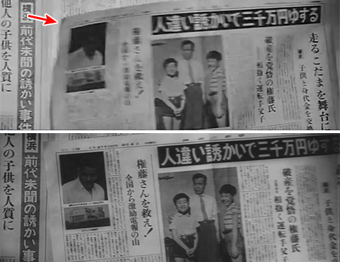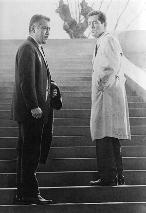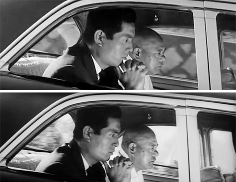 「天国と地獄」に限らず、予告編というものは撮影されたフィルムからハイライトシーンを選び出し、短く編集して製作されたもの、だから本編に登場するのと同じ映像で構成されているものだとばかり思っていました。 しかし「天国と地獄」の予告編を観ていると「あれ?このカット、本編のと微妙に違うような気がするが・・・」と思うカットがいくつかあることに気が付きました。もちろん前述した「予告編だけに登場するシーンがある」は別にしてのことです。 「天国と地獄」の予告編は最初の「東宝マーク」から始まって全部で29のカットで構成されています。29なら出来なくはないだろうと全カットを本編と比較してみました。 驚くべきことが分かりました。最初の「東宝マーク」を除き、全てが本編とは違う映像なのです。 当時の予告編の編集は助監督の仕事だと聞いたことがあります。監督になるための修行のひとつだったそうです。他の作品の予告編を検証したわけではないので、全てがそうなのかは分かりませんが、予告編の素材が本編に使用するフィルムを複製したものではなく、撮影したフィルムの中から本編には使用しない部分を使って製作するのだとしたら、本編とは違う映像ばかりで構成されているのは当然のことであり、「驚くべきこと」と書きましたが、これは常識なのかもしれませんが。 では少し長くなると思いますが、予告編全29カットの本編との比較をごらんください。 以下、上下二枚並んでいる画像は上が予告編、下が本編からのものです。 |