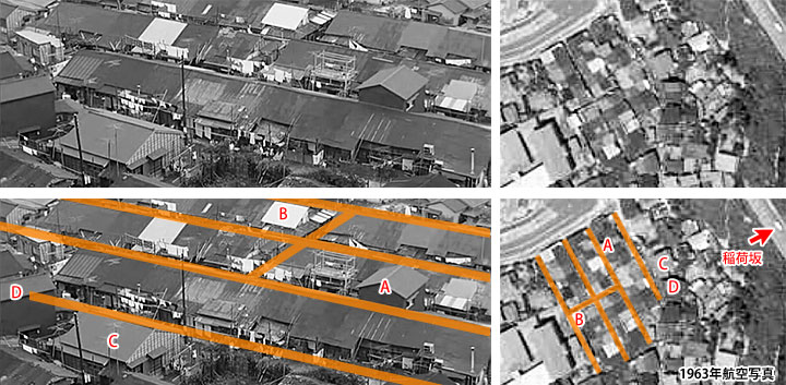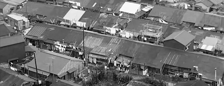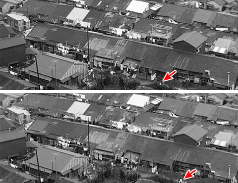 ↑ 予告編場面では長い3列の長屋に沿ってだいたい4本の路地が通っているように見えます。そして向こう2列には切れ目のような状態が見えます。1963年の航空写真にもその様子が見えます。そしてA,B,C,Dが合致しているように見えます。間違いないです。 この住宅、2007年に取り壊されたということが分かりました。意外と最近まで存在していたのです。 大正12年の関東大震災、その2年後に建てられた仮設住宅だったということです。解体時には長年にわたる改築や増築(予告編場面でもそれがうかがえます)が施されていましたが、当時の資料によると新築時には合計68戸の平屋住宅で、その間取りまでもが分かります。 静止画では分かりずらいのですが、冬の撮影時期にもかかわらず、白い夏服を着た人が何人も路地を行き来していて、白い洗濯物がたくさん干されているのが見えます。本編開始から1:10の刑事が車で坂を下るシーンを撮影したついでに、ちょこっと撮ったショットを「お、これ使えそうじゃない。予告編にでも使うか」ではないのです。十分な準備がされているのです。それで本編ではボツだものなあ、すごいなあ、と思います。 (協力:原田さん・網野さん・三浦さん)