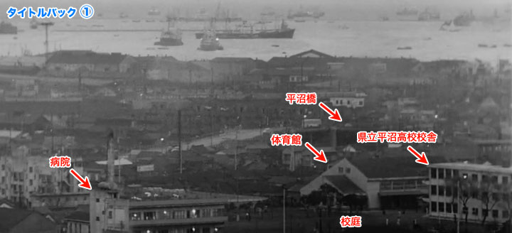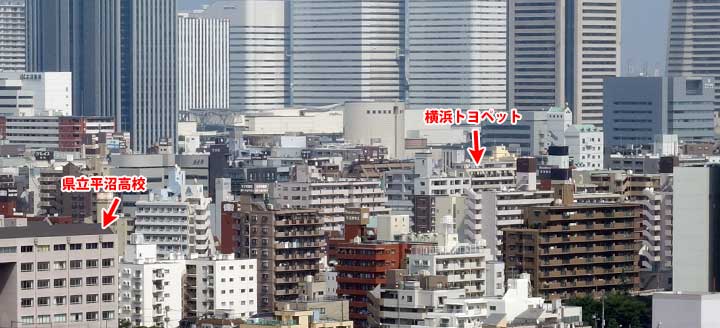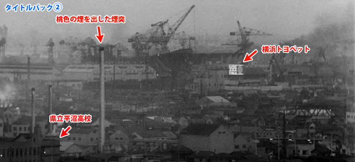 ↓ タイトルが消えるとバックが変わって2場面目になります。 これも文字が消える瞬間があるので、その画像でごらんください。 ![]() ![]() ![]() (撮影・2014・07・22) 手がかり 中央やや左に「桃色の煙を出した煙突」(「東宝映画のロケ地を訪ねる・天国と地獄」で特定済み)、右奥にトヨペットのネオンサインが見えます。 調査の過程 この場面も「タイトルバック①」と同じように背景に港が見え、高台からの撮影のようです。やはり「タイトルバック①」と同じように権藤邸からの撮影と仮定すると、桃色の煙を出した煙突の位置から推定して「トヨペット」のネオンは高島町交差近くにある「横浜トヨペット本社」ということになります。「タイトルバック①」で右側に写っていた県立平沼高校が今度は左端になっています。カメラを右に振ったということのようです。 結論 この画面もやはりカメラ位置は権藤邸。「タイトルバック①」からカメラを一画面分くらい右(南方向)に振った構図です。 同じ撮影範囲の現在を見てみましょう。左端に建て替えられた平沼高校の校舎が見えます。桃色の煙を出した煙突が立っていた工場はすでに取り壊されているので、煙突はありません。工場跡地には歯科技工士の専門学校が建てられています。しかし手前の建物の陰になっていて、ここからは見えません。横浜トヨペットは現在も同じ位置にありますが、これもよく見えません。 まあしかしこの角度から見ると「みなとみらい」方面に隙間なくビッシリ建っているように見える高層ビル、凄いことになっています。 ↓ タイトルバック①、②に写っている権藤邸から比較的近い建造物を、当時に撮影された航空写真で平面図的にみると下のようになります。