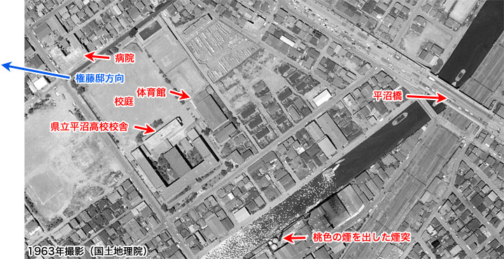 いつもご協力いただいている横浜のHさんとは同級生、Mさんが教えてくださいました。頼もしいです。この画面は「稲荷坂」から見た「千歳橋」方向とのことです。 「千歳橋」。なるほど「特報」の画面を見ますと川こそはっきり写ってはいませんが、川がありそうな雰囲気は感じます。地図上で「千歳橋」を探してみますと、権藤邸のある「横浜市西区浅間台」からは南方向の「横浜市南区浦舟町」にその名の交差点がありました。しかしそこは「橋」とはいっても下に川なぞ流れていなく、上に高速道路が通る大きな交差点です。「特報」場面とは似ても似つかない場所です。おかしい・・・ 映画公開と同年、1963年の航空写真を見てみました。 あっ!「千歳橋」の下は川! 当時は川(水路)があったんです。それが首都高速建設の時に埋め立てられ、現在の千歳橋の下に川は無いのです。そうだったのか! 「千歳橋」の西側の袂(たもと)は五叉路になっています。川沿いの道から北北西方向に斜めに入る、比較的細い道路があります。「特報」ではその道路が画面上部に真っ直ぐ見通せるような方向に写っています(矢印)。その逆の延長上がカメラ位置ということになります(下図)。なるほど!そのライン上の稲荷坂にちょうどいいカメラポイントになりそうな場所があります。 稲荷坂のその位置から千歳橋方向を見たとすると、あ、なるほどなるほど、こうなっていたわけか!と道路、川の位置がやっと理解できました。それが上に掲げた特報からの画面に色分けした図です。黄色が道路、青が川です。 いやあ、素晴らしい!さすが地元横浜の方の土地勘です!ありがとうございました。