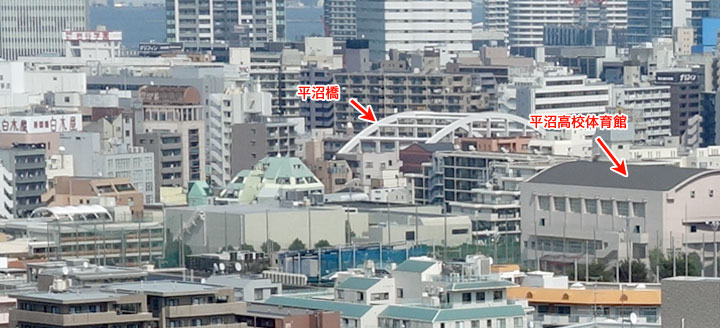 ↓ まず佐藤勝の音楽とともに東宝マークが映し出され、「東宝株式会社 黒沢プロダクション 作品」と文字が続きます。その次にドーンと映し出される第1番目の場面が「天国と地獄」とタイトルが書かれたこの画面です。 この場面ではタイトル文字が消えて、背景のみが残る一瞬があるので、その画像で見てみましょう。 ![]() ![]() ![]() (撮影・2014・07・22) 手がかり 港を背景にして手前右側に、学校のような建物が写っています。校庭も見えます。建物の向こうには道路が橋のように跨いでいる様子が見えます。 調査の過程 この画面が何処であるかは、画面に見える学校が県立平沼高校の旧校舎と体育館であるということを地元Hさんより教えていただきました。さすが旧校舎を知る地元Hさんならではです。そうなるとカメラの位置や方向も見当がつけられそうです。 結論 予想通りカメラ位置は権藤邸。そこから東方向、県立平沼高校方面を見おろしています。 「病院」と書き入れましたが、現在ここに病院はありません。しかしここが病院であったことは当時の住宅地図から確認することができます。 この病院だけ照明が入れられ(タイトルバックの11画面、全て薄暗い夕方のように見えますが、フィルム感度の問題でしょうか、実際はどうやらそれほど暗い時間に撮影されたのではないようです。ほとんどの建物に照明がついていないことでそう思えます)静止画では分かりづらいですが、屋上には、いかにも病院ならではといった洗濯物などが干してあります(これも「仕込み」かもしれません)。当時の病院、シーツや包帯などの洗濯は業者に出さず、病院内で洗濯していた場合が多いと思います。この病院が犯人竹内が働く病院ということではないでしょうが、画面上の「アクセント」としてここが病院だと強調しているような気がします。 現在の写真ももちろん、当時カメラが据えられた権藤邸のセットが建てられた位置から撮影したいところです。 しかしセットが建てられた場所には現在、マンションが建っていて立ち入ることはできません。ところが幸運なことにHさんのお知り合いにこのマンションの関係者がいらして、屋上に上がらせていただくことができました。 最初に屋上に上がらせていただいたのは2014年の7月9日のこと。最初に、と書いたのは実は二度この屋上に上がらせてもらっているのです。まず予定した最初の日は生憎の雨模様。近くの建物は見えるのですが、タイトルバックの望遠レンズで写し出されている遠くの様子は、霞んでしまって見えない状態でした。 Hさんとマンション関係者の方に無理をお願いして二度目に訪れたのが7月22日。この日は快晴で上に掲載できたような鮮明な写真を撮ることができました。 マンションは半地下階を入れて5階建。そのためカメラの高さ的には10数メートル高い位置からの撮影になっている点をご了解ください。平面図的には正確な位置から撮影できているはずです。 平沼橋は前述したように、現在はアーチ橋に架け替えられ、平沼高校も校舎、体育館、共に建て替えられていますが、もちろん位置的には完全に合致します。 現在、当時カメラが据えられたであろう同じ位置に立ち、同じ範囲を見てみるとこの変わり様です。高層ビルの隙間からわずかに「海」を見ることができる、といった状態でした。