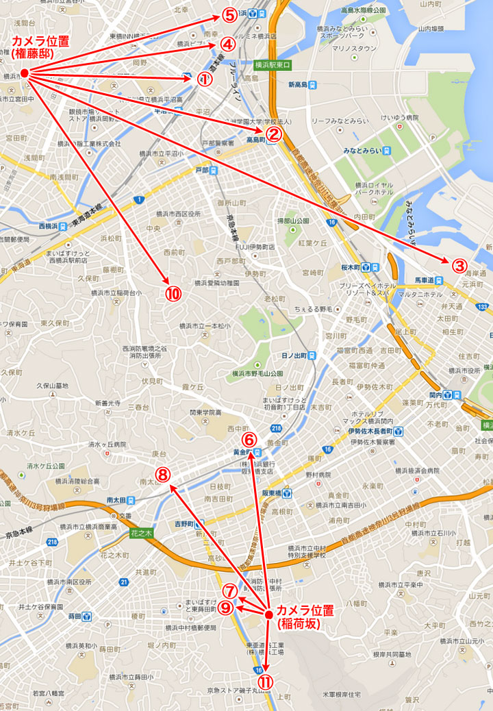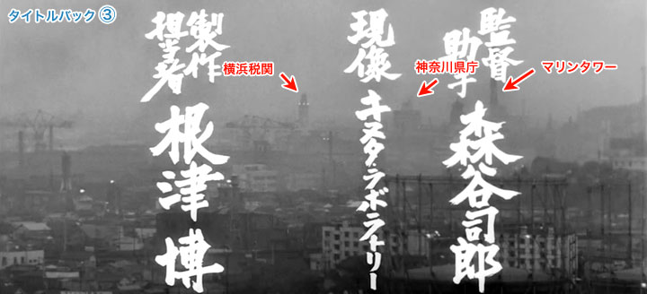 作品の最初の部分で、タイトルや出演者、スタッフを紹介する文字が映し出されます。文字の背景には横浜市の街並みの映像が使われています。全部で11の場面なのですが、どの映像もフィックス(カメラを固定し、方向を変えたりズームしたりしない)。そしてどの画面も薄暗い夕暮れ。しかも煤煙のモヤ越しに撮影されています。もちろん意図されていることでしょうが明瞭な画像ではありません。 これらに映し出されている映像は何処から何処を撮影したものなのか。これから始まるストーリーの流れから想像すると、高台に建つ権藤邸から見おろす街並み撮影したものと考えるのが妥当と思われますが、はたしてどうでしょう。(浅間台の権藤邸の位置については、このページの一番最初「浅間台の権藤邸はどこにあったのか」を参照してください) この「補足・些細なことなど編」では「東宝映画のロケ地を訪ねる・天国と地獄・ロケ地編」のように、撮影地を探し出して、その当時と現在を同じ位置から同じ範囲で撮影してみる、ということとは離れた話題で進めて行こうと思っていたのですが、気がついてみると、またしても同じことを始めていました。困ったもんです。 この検証にもHさんの絶大な協力をお願いしました。このタイトルバックに映し出されている映像、どれも望遠レンズで撮影されているので、写されている範囲は大変に狭く、しかも望遠レンズの特性上、前後の位置関係が分かりづらいのです。 1963年当時からは大きく変わった現在の横浜から、これらの場所を特定するなど、私には思いもよらなかったのですが、見事、すべてを解決してくださいました。いやあ、すごいです。 それではその全11場面を考えていきたいと思います。よろしくお付き合いお願いします。