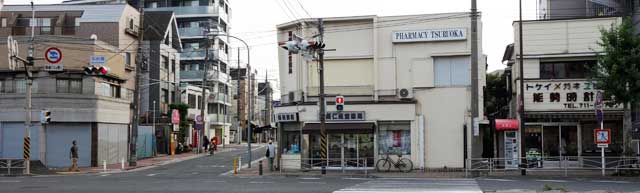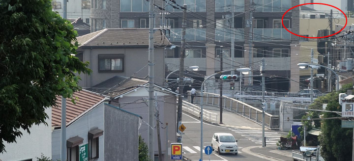 ↓ 7場面目です。 さらに盛大に文字が入ってしまいました。 ![]() ![]() (撮影・2014・07・22) 手がかり 静止画だと車の動きがわからないので理解しにくいのですが、左右に道路が通っています。道路の手前は川。道路から手前直角に橋が架かっています。道路の向こうは商店や民家が並んでいるようです。 調査の過程 川と道路が隣接している様子から、ここは根岸の北、掘割川と国道16号とアタリをつけました。 ここでHさんは画面右上に写っている一軒の建物が現在もそのまま残っていることを発見しました。寄棟屋根が特徴の二階建て商店のようです。画面右上の楕円形内です。 結論 このカメラ位置も「タイトルバック⑥」と同じ稲荷坂の途中です。 現在は川に沿ってマンションが建っているので、撮影地点からは件の建物はほとんど見えなくなってしまいましたが、かろうじて特徴のある寄棟造りの屋根が見えています。 ![]() 追記:この寄棟屋根の商店、2017年3月までには解体が済み、更地になっているのが確認されています。撮影地を証明するものが一つ減ってしまい残念です。 (情報提供・Aさん)