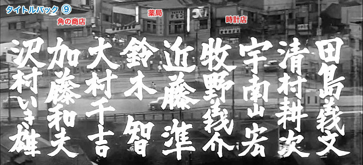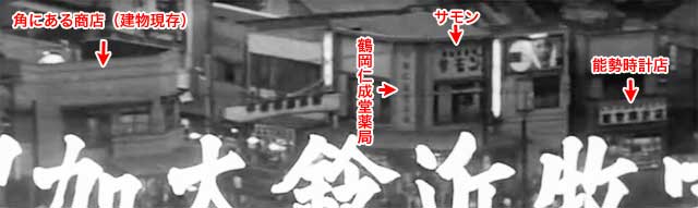 ↓ 次は9場面目です。 この場面も盛大に文字が入っている画面しか得られません。 ![]() ![]() (撮影・2014・07・22) 手がかり 手前の文字に重なった部分はやはり道路と川が写っています。そして幸運にも重要な手がかりは、文字の無い画面上部に集中しています。道路に沿って商店が並んでいるのが見えるのです。 調査の過程 ここでもHさんは大発見をしています。画面中央の商店の「サモン」と書かれた看板です。「サモン」は大正製薬が発売している滋養強壮薬。ここは薬局だったということが分かりました。 もしかしたら今でもここに薬局はないだろうか。道路と川との様子からして、ここは「タイトルバック⑦」に近い場所と思われます。その近辺を探してみると、薬局ありました。しかも建物は当時のままです。薬局の隣は時計店、これも当時のままです。時計店とは逆となり、商店街の道を挟んで角の建物、現在は店を閉じられていますが(呉服店であったとの情報あり)建物は変わっていません。いや、すごいな!思わず興奮です。 結論 この画面も稲荷坂からの撮影で、「タイトルバック⑦」からカメラを少し左(南)に振った構図、国道16号の中村橋交差点付近が写されています。 当時と同じカメラ位置からでは、新しくできた建物に遮られて薬局などの商店が確認できません。いたしかたなく坂をおりた地点から見えた様子を現在写真としました。 ![]()