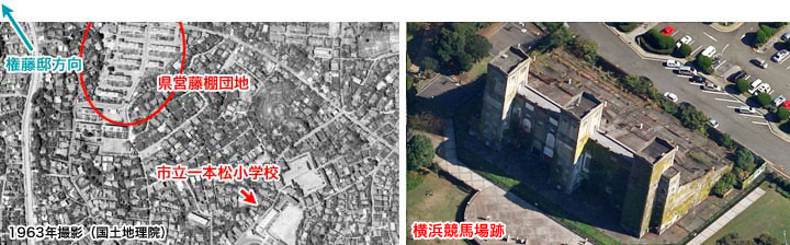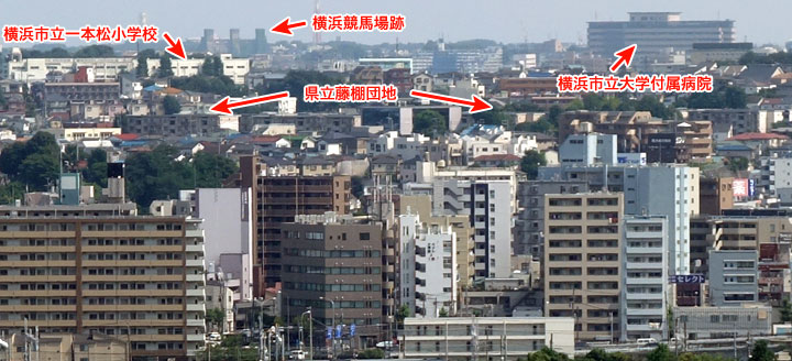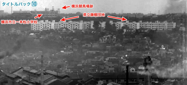 ↓ 次は10場面目です。 これは文字が入っていない瞬間があります。 ![]() ![]() ![]() (撮影・2014・07・22) 手がかり 中央に大きく団地のような建物が見えます。その左後方にも3階建くらいの鉄筋の建物が見えます。 調査の過程 この団地を権藤邸からは南方向に見える「県営藤棚団地」と仮定してみました。すると団地左奥の鉄筋建物は付近にある「横浜市立一本松小学校」ではないかということになります。 結論 「県営藤棚団地」と「横浜市立一本松小学校」の位置関係から推測すると、カメラ位置は再び権藤邸戻ったとするとぴたり合致します。 「県営藤棚団地」は県の物件案内を見ますと「建設年度:昭和57~60年度」とあるので、建て替えられているようです。しかし建物の位置は概ね変っていません。 一方、「横浜市立一本松小学校」は学校のHPを見ると1960年に鉄筋校舎完成とあるので、作品の画面に写っているのがそれです。さらに1993年に北校舎(画面では左寄り)改築工事着工とあるので、現在写真では鉄筋校舎が横に少し大きくなっています。校舎右部分は映画撮影時と同じ建物だと思います。 小学校のさらに向こうに三本の塔のような物がが写っています。(現在写真が分かりやすい)これはかつての横浜競馬場(根岸競馬場)にあった「一等馬見所」(1929竣工)で、戦後米軍に接収されましたが現在は返還され、建物だけが巨大な廃屋状態で今も残っています。 ![]()