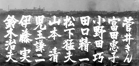 ↓ 8場面目です。 これまた盛大に文字が入っています。 ![]() 手がかり 中央やや上を左右に高架鉄道が通っています。映画をみると電車が通過しています。 鉄道の向こうに街路灯が連なっている通りが見えます。 調査の過程 高架鉄道はタイトルバック⑥と同じ京浜急行と見て間違いないでしょう。となるとカメラ位置はやはり稲荷坂から北方向ということになりそうです。 結論 タイトルバック⑥では京急の黄金町駅のやや西の方角を撮影していましたが、ここではカメラをさらに少し左に振り、隣駅である南太田駅のやや東の方角を撮影しています。 線路の向こうに見える街路灯の連なり(右上矢印)は、平戸桜木道路から北に入る「ドンドン商店街」ということになります。「ドンドン商店街」とは斬新なネーミングですが当時からこの名称であるようで、賑やかな商店街だったということです。 中央やや左に煙突(左上矢印)が見えます。これは銭湯の煙突です。画面の下方に銭湯の屋根が見えます。この銭湯、「大和湯」(現在は廃業)といい、鎌倉街道の吉野町三丁目交差点近くにありました。方向的にはドンピシャです。 (協力・Mさん、Aさん)