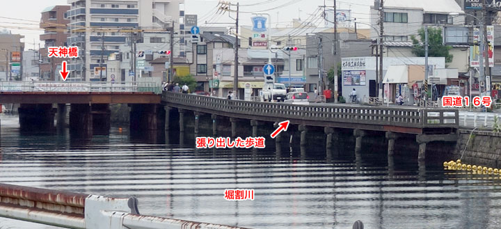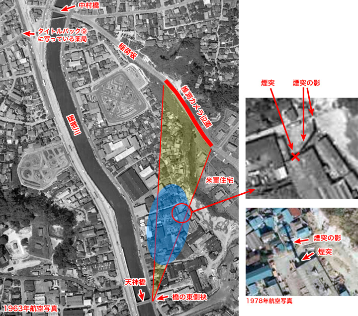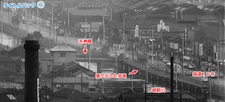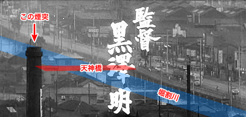 ↓ いよいよ最後、監督を紹介する11場面目です。 これも文字が入っていない場面がありますのでご覧ください。 ![]() ![]() ![]() (撮影・2014・07・09) 手がかり 川が流れ、それに沿って通る道路が写っています。川には橋が架かっています。橋の手前の道路の脇に、川から柱が立てられ、その上に川に張り出すようにして作られた柵のある歩道のようなものが見えます。 調査の過程 ここもまた川と道路が並んでいるので「タイトルバック⑦」「タイトルバック⑨」と同じように掘割川、国道16号と想像できます。「川に張り出すようにして作られた柵のある歩道」が現在も残っていれば特定できるのですが、これがなんと残っていたのです。 結論 カメラは再び稲荷坂に戻りました。 ここはタイトルバック⑦、⑨で映し出されていた掘割川、国道16号沿いの地点よりも、カメラを大きく左(南)に振った地点が写されています。 しかし現在、稲荷坂から崖下を覗くような状態でこの「川に張り出すようにして作られた柵のある歩道」あたりを見てみても、タイトルバック⑨の時と同じように、新しくできた建物に遮られて、川も道路も見ることができません。実際、現地に立ってみると、正確な方向などはっきり分からないのです。しかたがないので、カメラ位置は全然違ってしまいますが、掘割川のすぐ横まで降りて撮ったものを現在写真としました。この角度でも同じ場所であるということが、はっきり分かると思います。 ![]() ↑ さて、これで無事(?)タイトルバック全場面のカメラ位置と方向が解明できたと思われるのですが、この監督を紹介する最後のタイトルバックで、左隅の方に大きく煙突が写っています。良い構図です。ところでこの煙突、何処の煙突なのだろうと言う話になりました。 煙突と、その向こうに見える天神橋の東側の袂とが重なって見えます。カメラ位置は稲荷坂なので、稲荷坂の撮影位置と天神橋の東端を結んだ線上に煙突は存在したということになります。 しかし稲荷坂からの撮影には間違いはないと思うのですが、稲荷坂のいったいどのあたりの位置から撮影したのか、それがピンポイントでは分かりません。稲荷坂から撮影されたタイトルバックは、ここを入れて5画面あります。それらから正確な位置を割り出せるか。しかしそれらが同じ位置から方向を変えて撮影したとは限りません。むしろ方向毎に良い構図になるように、位置を変えて撮影したと想像する方が自然のような気がします。でも見下ろす角度から考えて、それほど坂の下の方ではなさそうです。まあ中腹と考えてみましょう。稲荷坂は全長でも300メートルほどの坂ですから、それでも煙突の方向の見当くらいはつきそうです。下図にそれを示しました。