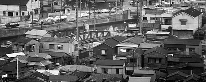 ↓ ⑨ 「本編」には登場しない場面が現れます。これは「予告編」にも登場しないのです。「特報」だけに使われている映像です。 何処なのでしょう。密集した家屋と道路、それに鉄橋のような橋が見えます。 横浜にお住まいのMさんによって、ここがどこだか特定されています。 詳しくはこの後の項「そして『特報』だけに登場するシーンもある」で説明することにします。
