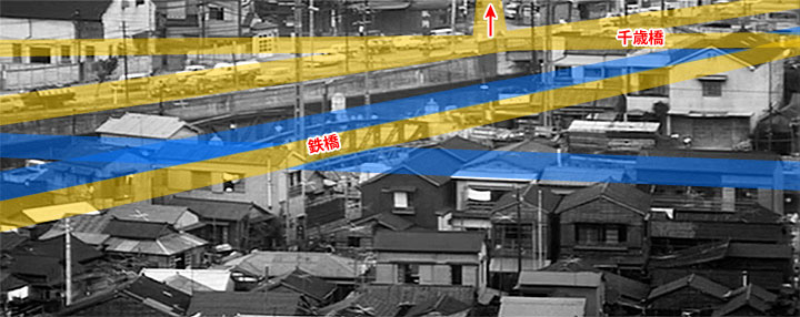 先程、「では『特報』ではどうなのか」の項で、「本編」にも「予告編」にも登場しない、「特報」だけに登場する場面が存在することを紹介しました。わずか2〜3秒のカットです。 改めてその画面を見てみましょう。 画面手前の方は平屋とか二階建ての木造家屋が密集しています。望遠レンズで撮影しているので、なおさら密集して見えるのだと思います。 画面左から斜め右方向に割合広い道路が通っているのが見えます。その手前、道路と平行して鉄骨でアーチ状にアングルを組んだ橋が見えます。 いったいここは何処なのでしょう。