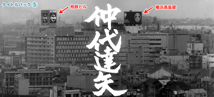 ↓ では次、5場面目です。 これも文字が入ってしまいますが、それほど差し支えはありません。 ![]() ![]() (撮影・2014・07・22) 手がかり 「高島屋」のマークと「ナショナル」と書かれた屋上看板がはっきりと写し出されています。 調査の過程 高島屋マークの看板はもちろん横浜駅に隣接した横浜高島屋屋上に、「ナショナル」の看板は当時「相鉄ビル」という建物が西口駅前にあり、その屋上に設置されたものだということが当時の写真から分かりました。 この「相鉄ビル」は現在は取り壊され、その跡地には「横浜ベイシェラトン」というホテルがそびえています。(1998年開業) 結論 ここは先程の「タイトルバック④」から、さらに約一画面分、左(北方向)に振った構図ということになります。やはりカメラ位置は権藤邸。 「タイトルバック①」からこの「タイトルバック⑤」までの5場面は、全て権藤邸という同じ撮影地点からカメラを左右に振って撮影したということになります。 ↓ タイトルバック④、⑤で登場する建造物を当時の航空写真で見てみました。