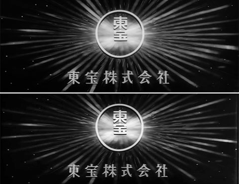 ↓ ① まず予告編も本編と同じように「東宝マーク」から始まります。これはモノクロ・シネスコ用として予め用意されている素材を使用するのだと思います。この「東宝マーク」は中心の「東宝マーク」のセンターから(ややこしい)輝く光条が回転するような動きを見せます。さらに光条は外に広がるような動きもあり、全体として二度と同じ模様を繰り返すことはありません。しかし、予告編、本編、共通して光条が同じ状態の瞬間がありました。やはり同じ素材からです。この一致は本編からの流用というより、予め用意されている素材なので当然なのでしょう。