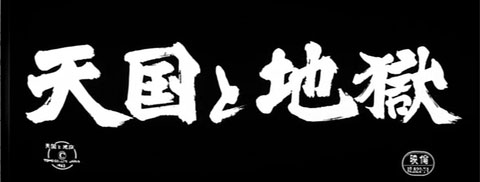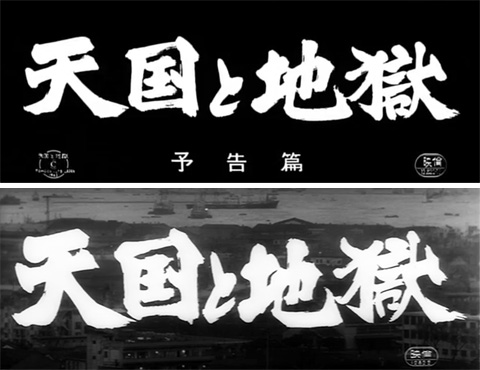 ↓ ④ さて予告編でも話題にした書家、西川寧氏によるタイトル文字「天国と地獄」が出ます。 実はここでも本編、予告編ともまた細部が微妙に違ったタイトル文字になっているのですが、ここではこの問題は通過することにします。