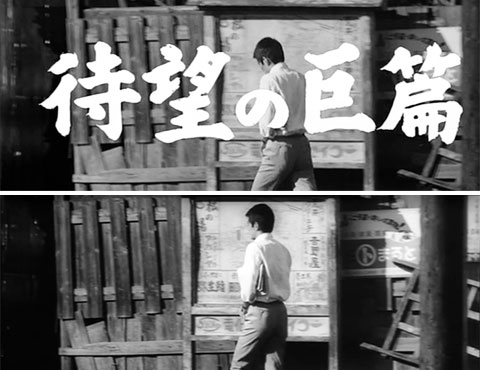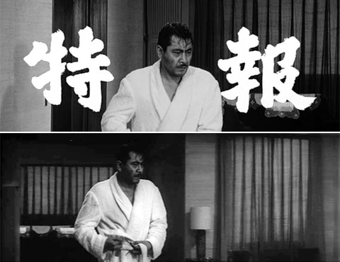 前項で「予告編」に使われている映像は「本編」と同じものなのかを見てきました。結果、最初の東宝マークを除いて、一つとして同じものはないということがわかり、驚きました。 さて、映画館で本編公開の間近になると上映されるのが「予告編」ですが、さらにもう少し前の段階で「特報」というものが上映されることがあります。「天国と地獄」にもそれが存在します。 では「特報」に使われている映像はどうなのでしょう。「本編」とも「予告編」ともまた違う映像なのでしょうか。同じように見比べてみました。結論を言うと、予想通り「本編」にも「予告編」にも登場しない、別物の映像からできていたのです。 「特報」はまだ「本編」撮影途中に編集されたものと思われ、使用できる素材フィルムが少ない為か「予告編」に比べると短めです。「予告編」は3分37秒、29カットでしたが「特報」は1分52秒、16カットです。 では見ていきましょう。以下、上下二枚並んでいる画像は上が「特報」、下が「本編」からのものです。 |