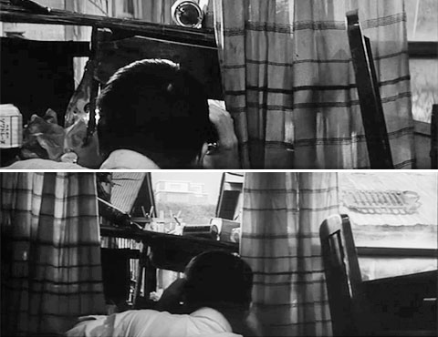 ↓ ⑭ 田口、荒井(木村功)の両刑事が腰越の別荘に向かい、別荘内に死体を発見するシーンです。 荒井刑事が拳銃を構え、家の中の様子を伺いながら移動します。死体があると分かると拳銃をしまい、ハンカチで口をおさえます。この動きが予告編、本編を比べても違いがまったく見いだせないのです。これは「予告編、本編で同じカットは無い」という仮説も崩れたかな、とあきらめる寸前、違いを見つけました。本編では外に干してあるタオルのようなものが風になびくのです。予告編ではなびきません。さらに気がついてみると部屋の中に吊るされた蚊帳(かや)も揺れ方が違います。別テイクです。それにしても全く同じ動きができる木村功に驚きました。