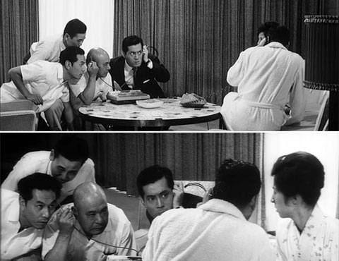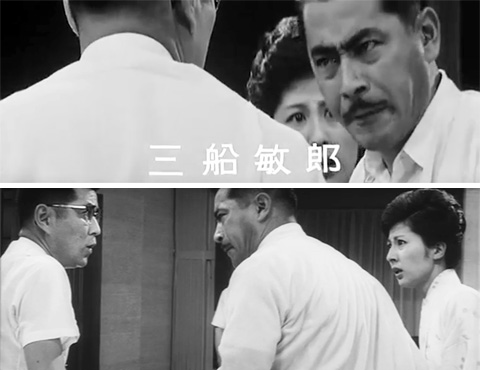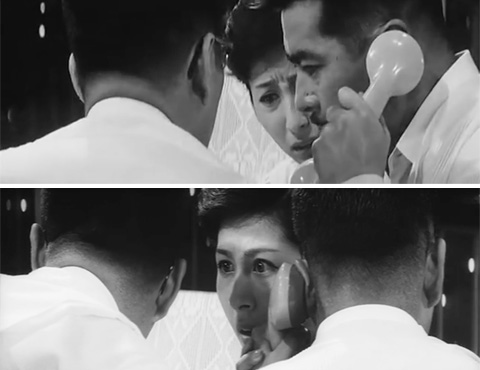 ↓ ⑦ 河西(三橋達也)が誘拐されたことを電話で警察に知らせようとすると権藤(三船敏郎)が「警察に知らせたら純が危ない!」と止めるシーンです。 全く違うアングルです。これも前述した「マルチカメラ」の別アングルです。 しかも「警察に知らせたら純が危ない!」と権藤が言った後、権藤の妻、怜子(香川京子)がそれに被せるように「あなた、あなた」と言うタイミングが予告編、本編で微妙に違うので、テイク(同一カットを複数回、繰り返し撮影したとき、そのそれぞれの撮影した映像)も別だと思われます。