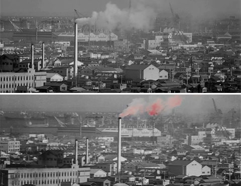 ↓ ⑧ 権藤邸から見た横浜市内です。 中央やや左に、煙が出ている煙突が写っています。これは例の桃色の煙を出した煙突です。煙に着色された本編と比べてみますと、カメラの方向が少し違うだけで、太陽光などの具合を見ますと同じ時に撮影したものだと思われます。 本編の始まり、クレジットのバックにも「特報」とほぼ同じように、煙突が中央から左にずれたアングルの画面が出てきますが(写真いちばん下)もっと薄暗くなった時間帯に撮影したもので、素材としては別物です。 「予告編」にこの場面は登場しません。 このあたりからギターの音楽が入ります。「天国と地獄」本編では聞いたことがありません。これは「悪い奴ほどよく眠る」(1960年の黒澤作品)からのものです。