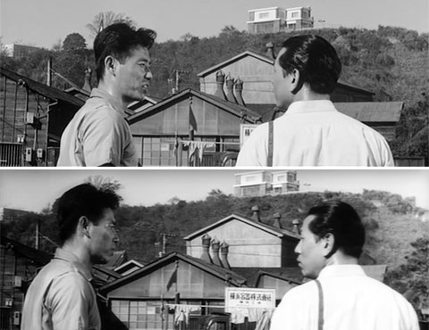 「天国と地獄」にも勿論、予告編が存在します。DVDなどを購入すると予告編が映像特典として付属しているので見ることができます。 それを見ていて気がつくのは「あれ?こんなシーン、本編にあったかな?」という場面がいくつか出て来ることです。その中の一つに、木造の長屋が軒を並べているカットがあります。本編には登場しません。本編に登場しないからといって、ここが何処なのかを特定しないわけにはいかない、という、まあ困った話です。 あるSNSでHさんがこの話題についてコメントされました。するとHさんのお知り合いに「天国と地獄」や昔の横浜について興味を持たれている方が何人かいらして、ついにここが特定されてしまいました。いや、さすが地元横浜の方々です。すごいです。 結論を申しますと、ここは本編開始から1:10、戸倉警部と田口刑事が権藤邸を後にして車で坂を下る「稲荷坂」の途中から下を見おろした構図です。