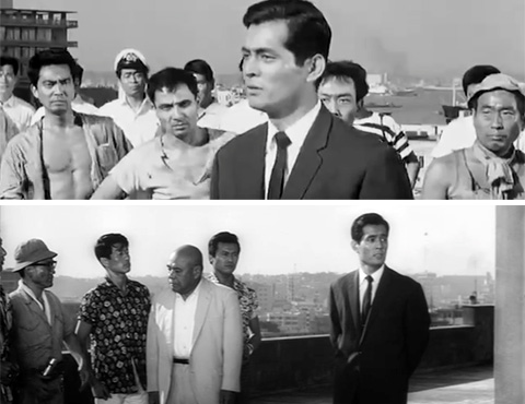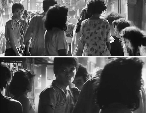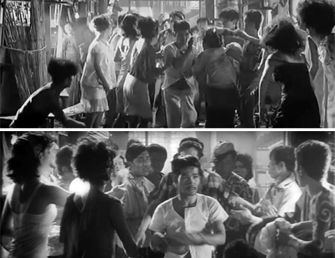 ↓ ⑨ 麻薬街のシーンです。「マルチカメラ」の別アングルです。 本編で中央に見える麻薬中毒者(鈴木和夫)がアイスクリームを口から離すタイミングを基準に予告編、本編を比較すると他の麻薬中毒者たちの動きが一致するので、テイクは同じだと思われます。