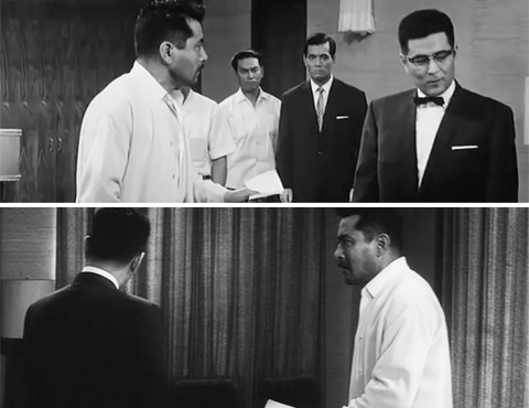 ↓ ⑩ 権藤が河西に五千万円の小切手を見せ「これがある限り、逆に貴様らを叩きだしてやる!」というシーンです。 これはマルチカメラではなく、別途に撮影したのだと思います。なぜならマルチカメラだとしたら、本編のカットを撮影しているカメラの位置が、予告編では戸倉警部(仲代達矢)が立っている位置の方向になり、カメラが写ってしまうのでそこにはカメラを置けないからです。権堂と河西のセリフを聞いても微妙に違いがあります。