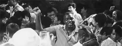 ↓ ⑬ 竹内が麻薬の取り引きに酒場を訪れます。外国人の客、売人の女、変装した刑事らが見えます。しかしこのようなカットは本編に登場しません。