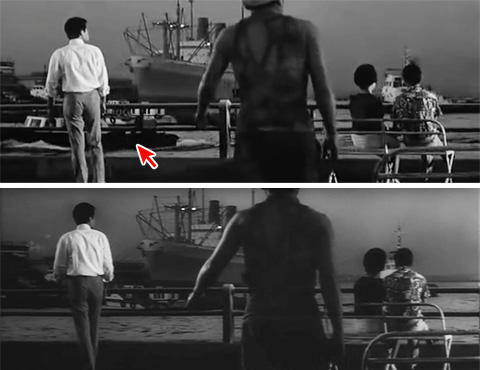 ↓ ⑮ 竹内が山下公園をうろつくシーンです。刑事が変装した浮浪者、ベンチに座ったカップルの動きも違いますが、いちばんの違いは予告編では海上をボートが横切るとことです。別テイクです。