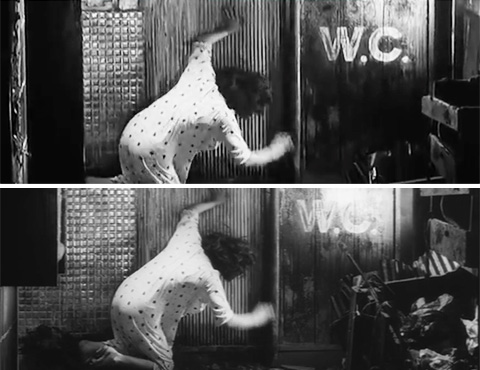 ↓ ⑳ カメラ位置や画角はあまり変わらないのでマルチカメラではなく一台のカメラで別テイクかとも思いましたが、崩れ落ちる中毒者(富田恵子・草笛光子の実妹)の姿勢が別テイクでここまで一致するものでしょうか。「W.C.」と書かれたドアにあたる照明が違いや、カメラ位置の微妙な違いから、やはりマルチカメラの別カメラ映像で、同テイクかと思われます。