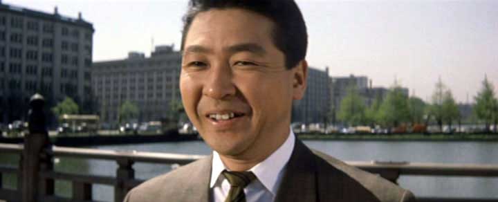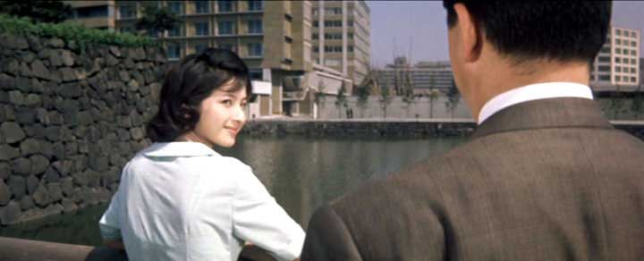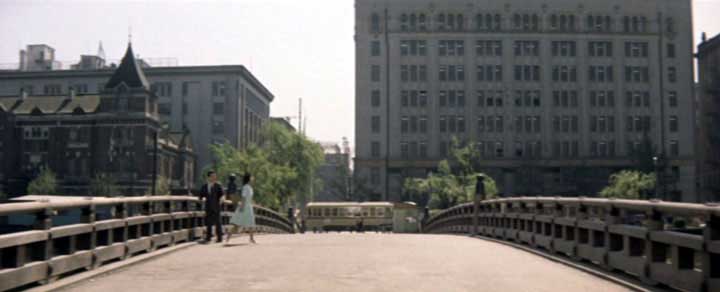 開始より1:29(東京都千代田区皇居外苑・和田倉橋) 桜堂製薬の社長秘書、南(小林桂樹 )と敬子(藤山陽子)は同僚でもあり従兄妹同士でもある。敬子は南に好意をいだいているのだが、恋愛の対象として見てくれない南をもどかしく思っていた。 仕事上の関係の香港女性(尤敏)への恋にやぶれた南が、やさしく見守ってくれている敬子の愛に気付くラストシーン。一言のセリフも無い印象的なシーンだ。 ここは皇居外苑に架かる和田倉橋だ。丸の内のオフィス街からほど近い、ラストシーンにふさわしい美しい場所である。 |
